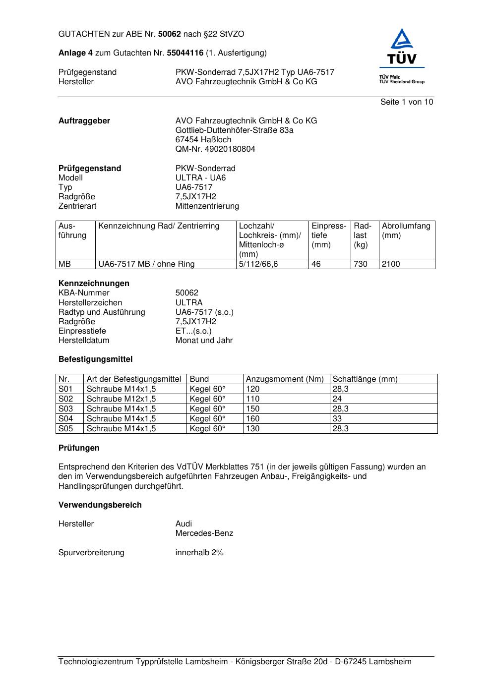 Dieses Gutachten (abe) bezieht sich auf die Alufelge AVO UA6-7517 in der Ausführung ET 0, Mittenloch 0 mm (KBA 50062). Im PDF findest du typischerweise zulässige Reifengrößen, Auflagen/Anbauhinweise und – je nach Dokument – Hinweise zur Eintragung.