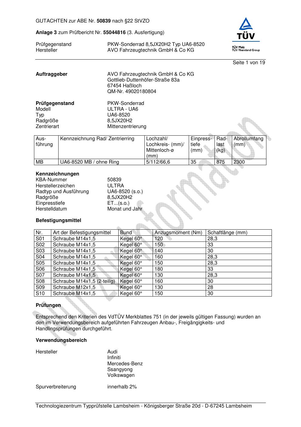 Dieses Gutachten (abe) bezieht sich auf die Alufelge AVO UA6-8520 in der Ausführung ET 0, Mittenloch 0 mm (KBA 50839). Im PDF findest du typischerweise zulässige Reifengrößen, Auflagen/Anbauhinweise und – je nach Dokument – Hinweise zur Eintragung.