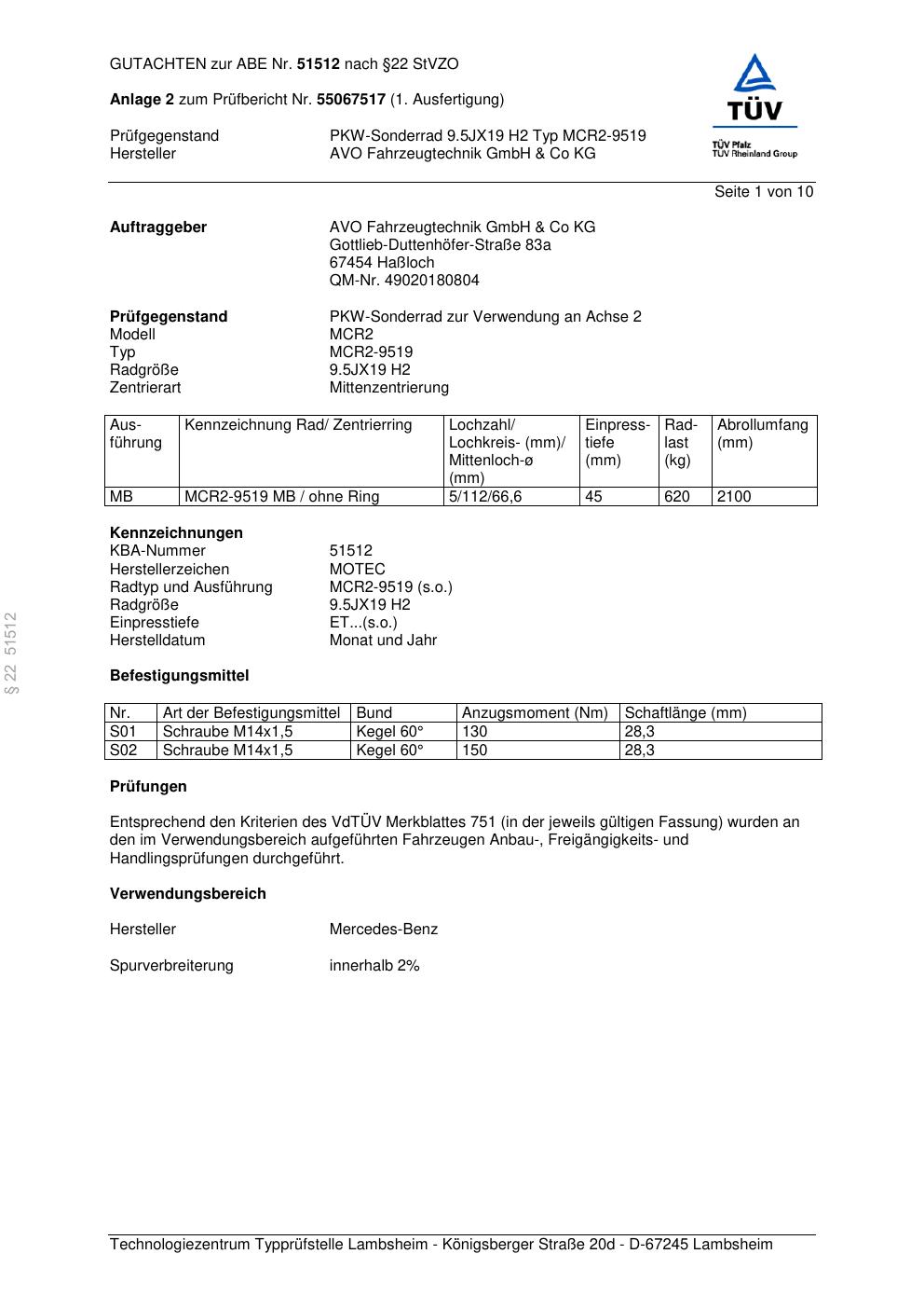 Dieses Gutachten (abe) bezieht sich auf die Alufelge AVO MCR2-95 19 in der Ausführung ET 0, Mittenloch 0 mm (KBA 51512). Im PDF findest du typischerweise zulässige Reifengrößen, Auflagen/Anbauhinweise und – je nach Dokument – Hinweise zur Eintragung.