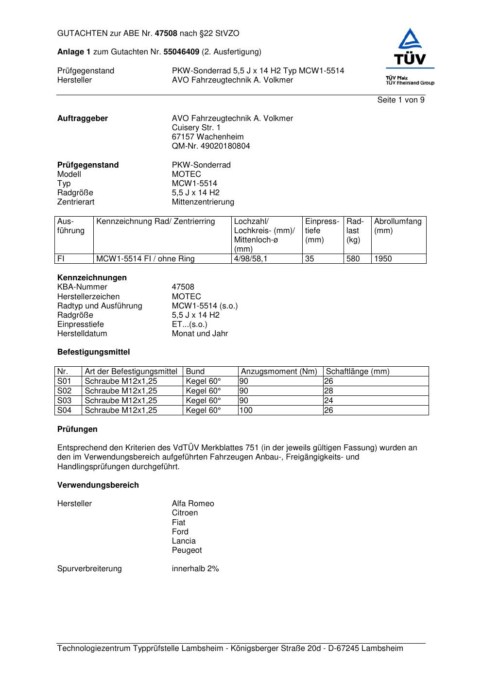 Felgengutachten / abe für Alufelgen AVO Fahrzeugtechnik A. Volkmer / MOTEC MCW1-5514 (ET 0, Mittenloch 0 mm) mit KBA 47508 (Zertifikatsnummer 47508). Hier kostenlos als PDF herunterladen. Der Download-Link ist 24 Stunden gültig und kann bis zu zwei Mal verwendet werden.