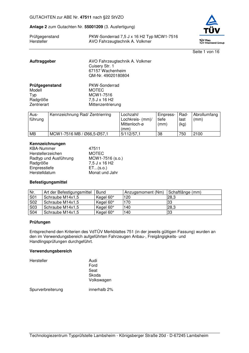 Felgengutachten / abe für Alufelgen AVO MCW1 -7516 (ET 0, Mittenloch 0 mm) mit KBA 47511 (Zertifikatsnummer 47511). Hier kostenlos als PDF herunterladen. Der Download-Link ist 24 Stunden gültig und kann bis zu zwei Mal verwendet werden.