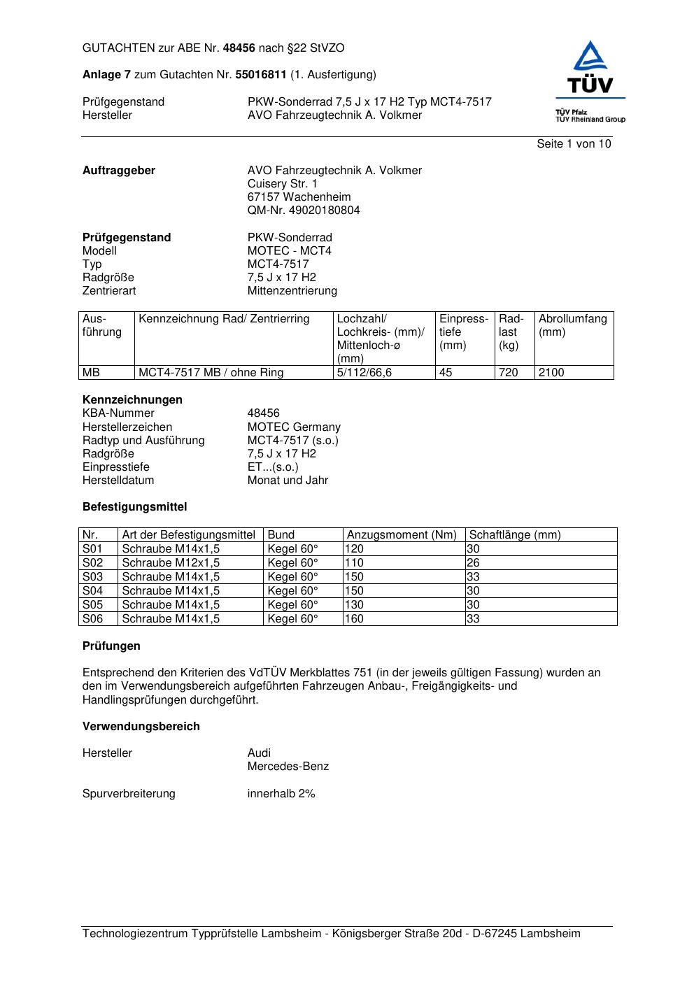 Dieses Gutachten (abe) bezieht sich auf die Alufelge AVO Fahrzeugtechnik A. Volkmer MCT4-7517 in der Ausführung ET 0, Mittenloch 0 mm (KBA 48456). Im PDF findest du typischerweise zulässige Reifengrößen, Auflagen/Anbauhinweise und – je nach Dokument – Hinweise zur Eintragung.