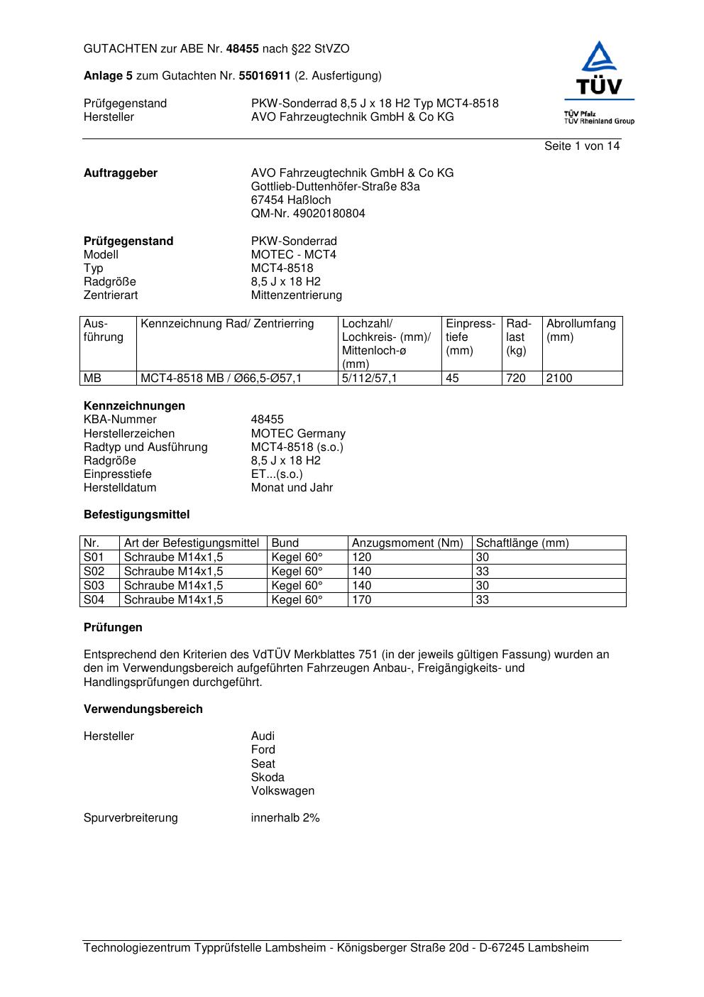 Dieses Gutachten (abe) bezieht sich auf die Alufelge AVO MCT4-8518 in der Ausführung ET 0, Mittenloch 0 mm (KBA 48455). Im PDF findest du typischerweise zulässige Reifengrößen, Auflagen/Anbauhinweise und – je nach Dokument – Hinweise zur Eintragung.