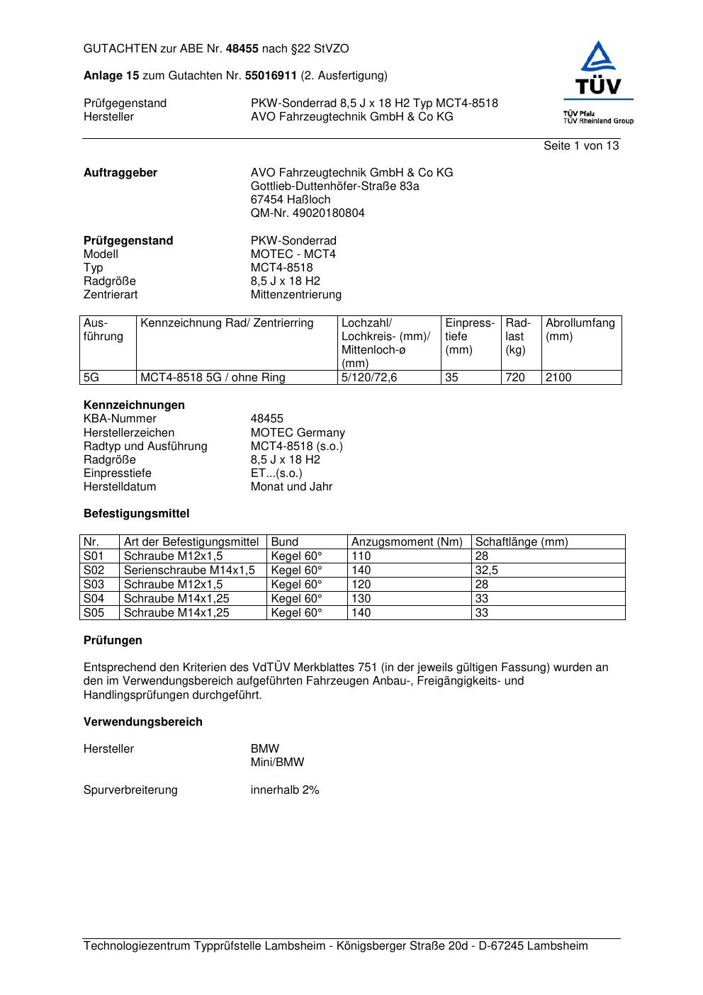 Dieses Gutachten (abe) bezieht sich auf die Alufelge AVO MCT4 -8518 in der Ausführung ET 0, Mittenloch 0 mm (KBA 48455). Im PDF findest du typischerweise zulässige Reifengrößen, Auflagen/Anbauhinweise und – je nach Dokument – Hinweise zur Eintragung.