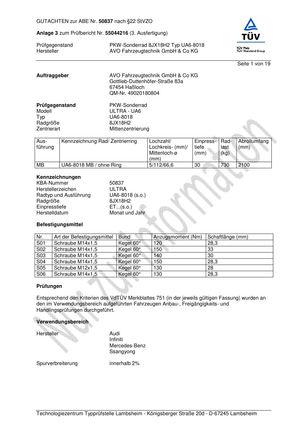Dieses Gutachten (abe) bezieht sich auf die Alufelge AVO UA6-8018 in der Ausführung ET 0, Mittenloch 0 mm (KBA 50837). Im PDF findest du typischerweise zulässige Reifengrößen, Auflagen/Anbauhinweise und – je nach Dokument – Hinweise zur Eintragung.