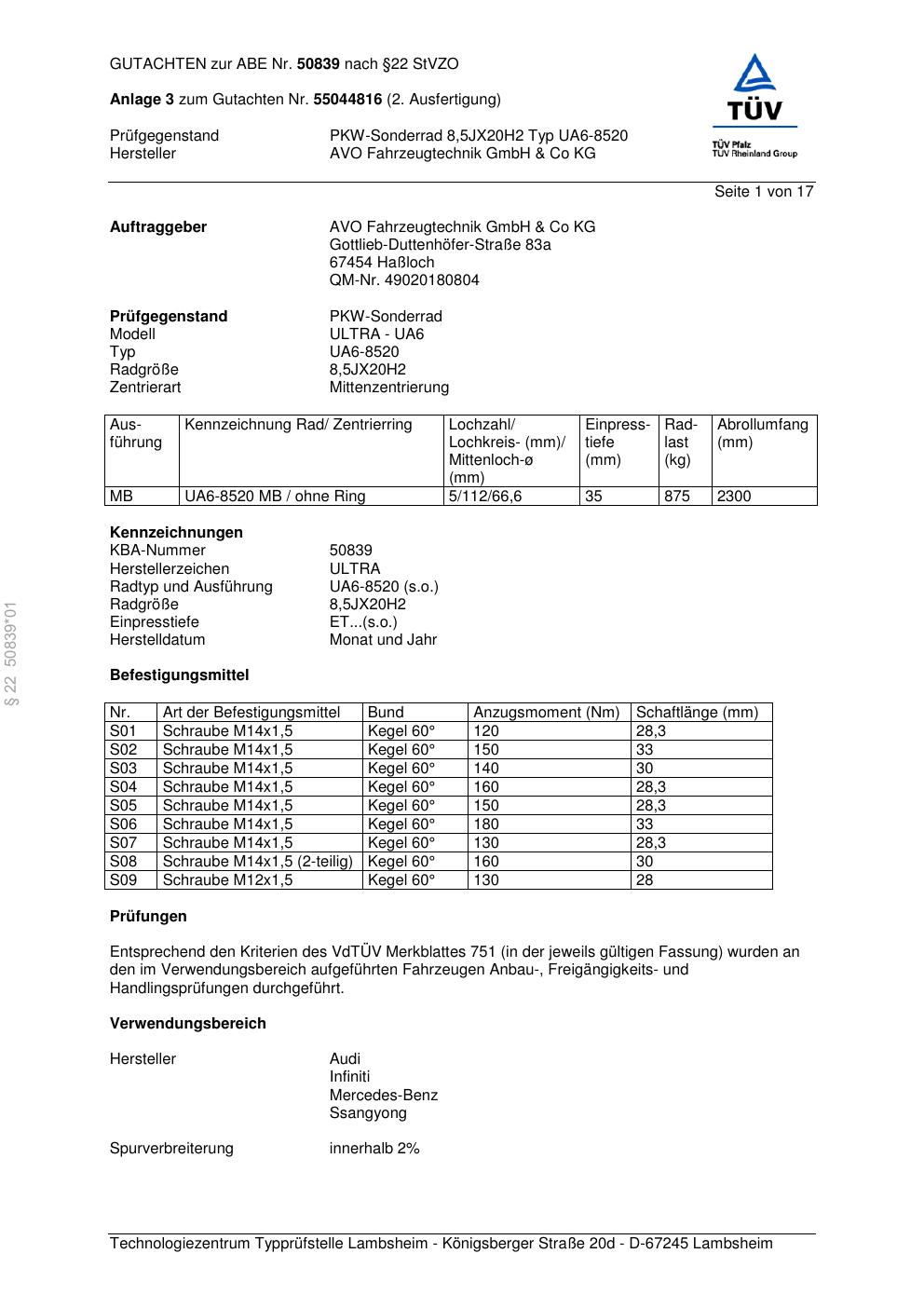 Dieses Gutachten (abe) bezieht sich auf die Alufelge AVO UA6-8520 in der Ausführung ET 0, Mittenloch 0 mm (KBA 50839). Im PDF findest du typischerweise zulässige Reifengrößen, Auflagen/Anbauhinweise und – je nach Dokument – Hinweise zur Eintragung.
