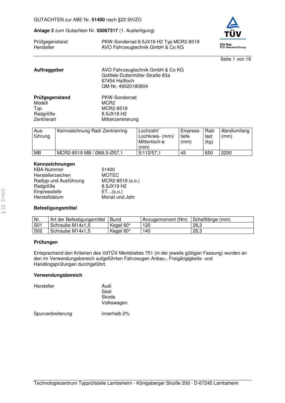 Dieses Gutachten (abe) bezieht sich auf die Alufelge AVO MCR2-8519 in der Ausführung ET 0, Mittenloch 0 mm (KBA 51400). Im PDF findest du typischerweise zulässige Reifengrößen, Auflagen/Anbauhinweise und – je nach Dokument – Hinweise zur Eintragung.