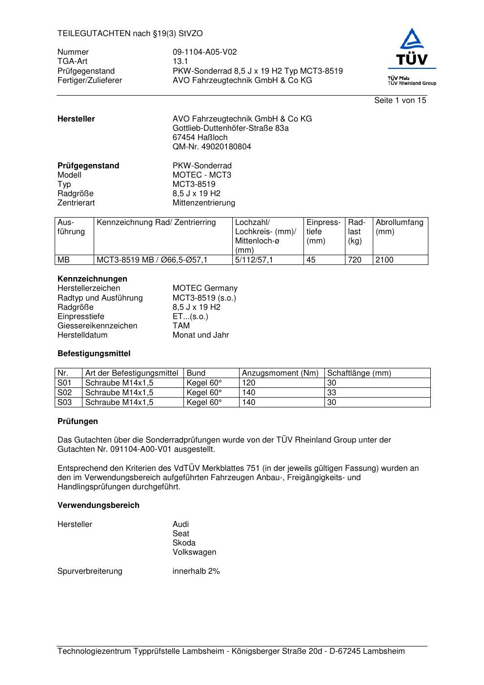 teilegutachten 09-1104-a05-v02 AVO Fahrzeugtechnik GmbH & Co KG (Herstellerzeichen: MOTEC Germany) MCT3-8519