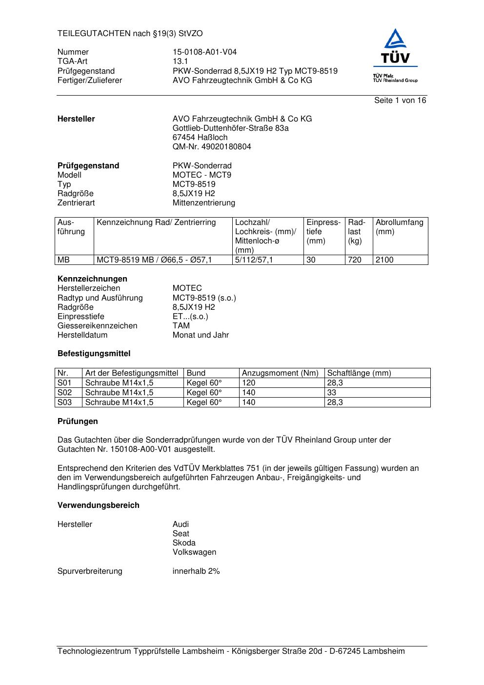 Felgengutachten / teilegutachten für Alufelgen AVO Fahrzeugtechnik GmbH & Co KG (MOTEC - MCT9) MCT9-8519 (ET 0, Mittenloch 0 mm) (Zertifikatsnummer 15-0108-a01-v04). Hier kostenlos als PDF herunterladen. Der Download-Link ist 24 Stunden gültig und kann bis zu zwei Mal verwendet werden.