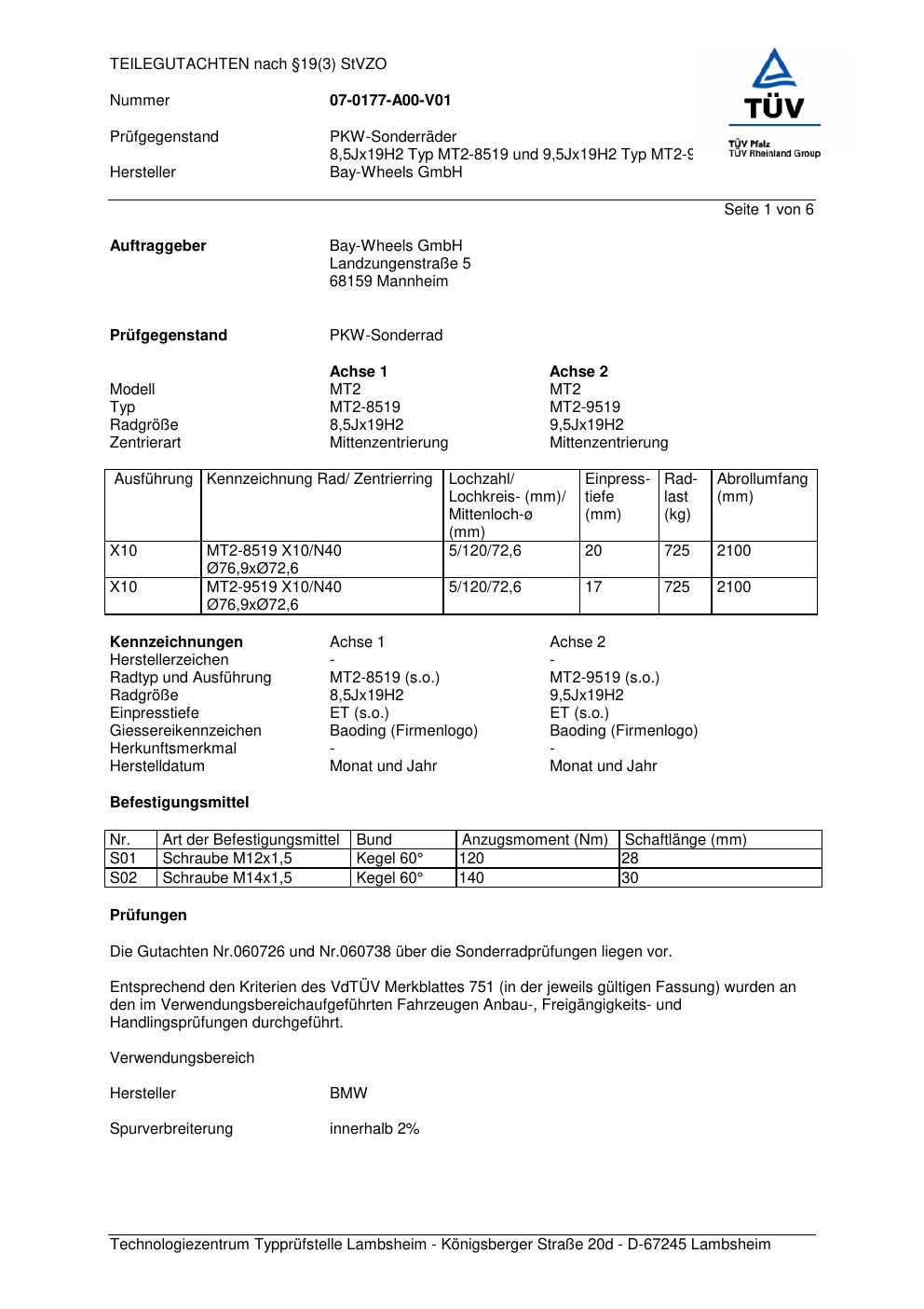 teilegutachten 07-0177-a00-v01 Bay-Wheels MT2-8519; MT2-9519