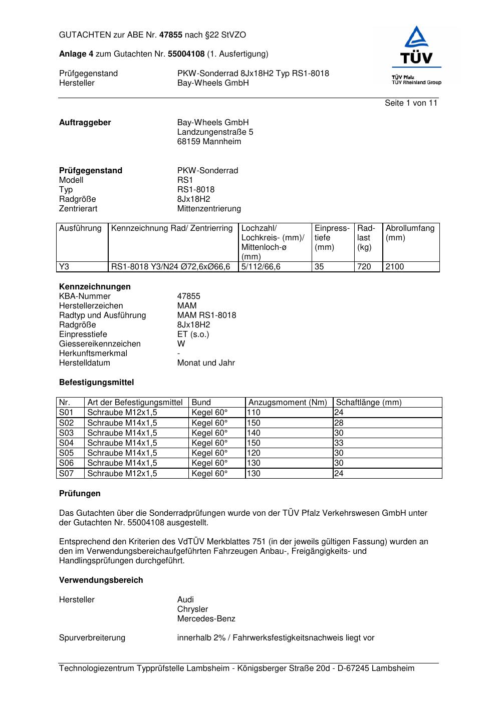 Felgengutachten / abe für Alufelgen Bay-Wheels RS1-8018 (ET 0, Mittenloch 0 mm) mit KBA 47855 (Zertifikatsnummer 47855). Hier kostenlos als PDF herunterladen. Der Download-Link ist 24 Stunden gültig und kann bis zu zwei Mal verwendet werden.