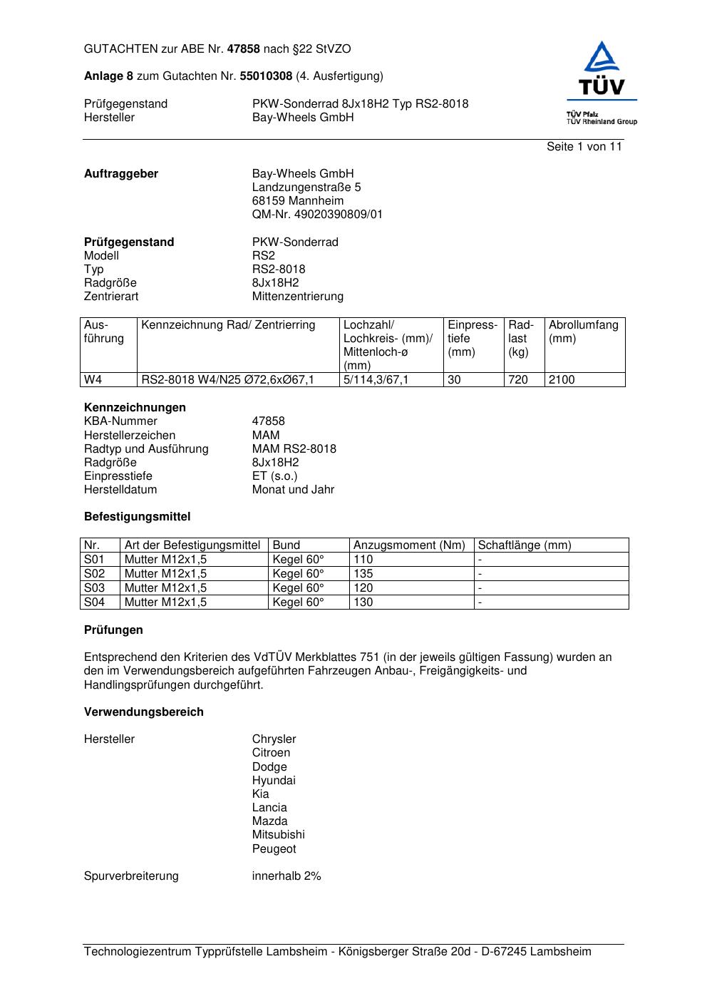 Felgengutachten / abe für Alufelgen Bay-Wheels RS2-8018 (ET 0, Mittenloch 0 mm) mit KBA 47858 (Zertifikatsnummer 47858). Hier kostenlos als PDF herunterladen. Der Download-Link ist 24 Stunden gültig und kann bis zu zwei Mal verwendet werden.