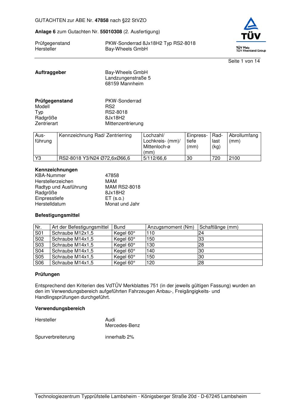 Felgengutachten / abe für Alufelgen Bay-Wheels RS2-8018 (ET 0, Mittenloch 0 mm) mit KBA 47858 (Zertifikatsnummer 47858). Hier kostenlos als PDF herunterladen. Der Download-Link ist 24 Stunden gültig und kann bis zu zwei Mal verwendet werden.