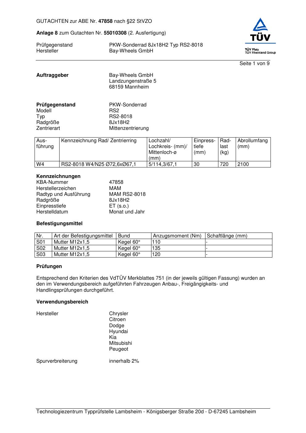 Dieses Gutachten (abe) bezieht sich auf die Alufelge Bay-Wheels RS2-8018 in der Ausführung ET 0, Mittenloch 0 mm (KBA 47858). Im PDF findest du typischerweise zulässige Reifengrößen, Auflagen/Anbauhinweise und – je nach Dokument – Hinweise zur Eintragung.
