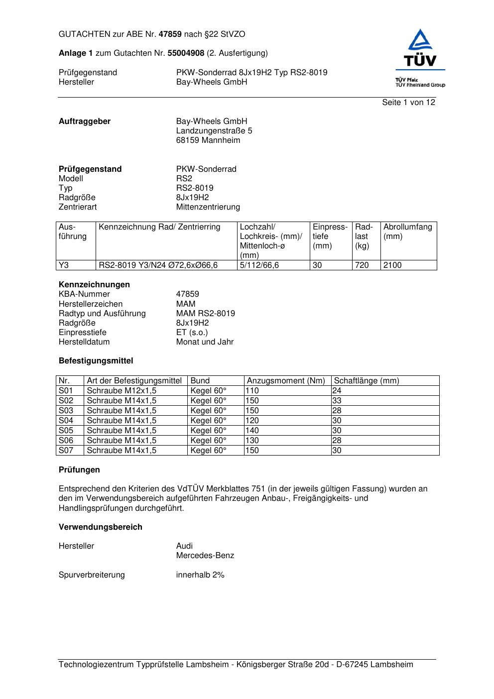 Dieses Gutachten (abe) bezieht sich auf die Alufelge Bay-Wheels GmbH (Herstellerzeichen: MAM) RS2-8019 in der Ausführung ET 0, Mittenloch 0 mm (KBA 47859). Im PDF findest du typischerweise zulässige Reifengrößen, Auflagen/Anbauhinweise und – je nach Dokument – Hinweise zur Eintragung.
