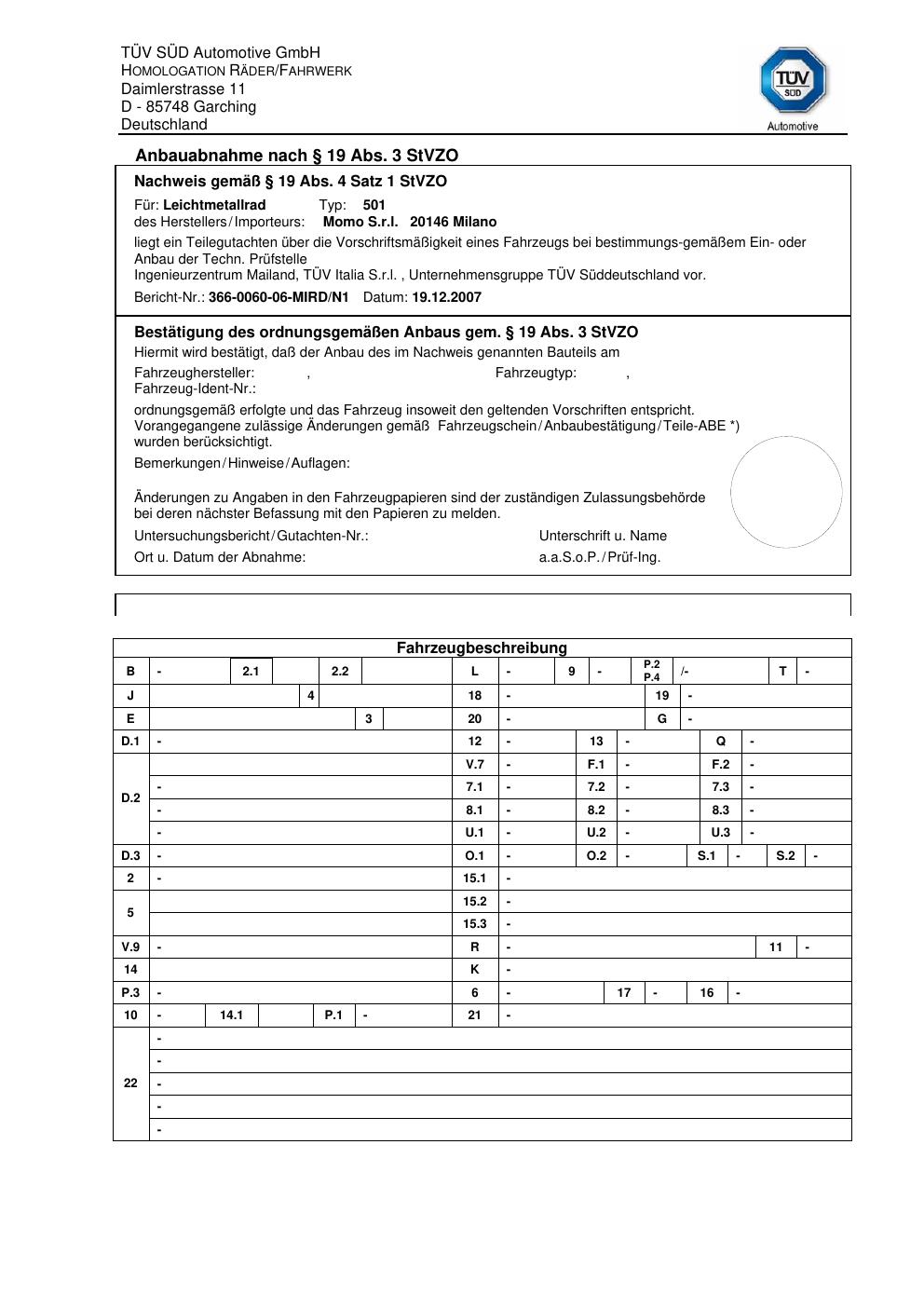 Felgengutachten / teilegutachten für Alufelgen Momo 501 (ET 0, Mittenloch 0 mm) (Zertifikatsnummer 366-0060-06-mird-n1). Hier kostenlos als PDF herunterladen. Der Download-Link ist 24 Stunden gültig und kann bis zu zwei Mal verwendet werden.