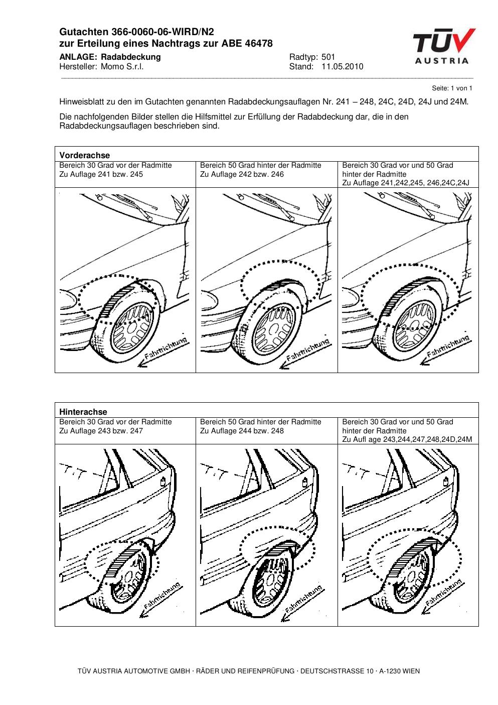 Dieses Gutachten (abe) bezieht sich auf die Alufelge Momo 501 in der Ausführung ET 0, Mittenloch 0 mm (KBA 46478). Im PDF findest du typischerweise zulässige Reifengrößen, Auflagen/Anbauhinweise und – je nach Dokument – Hinweise zur Eintragung.