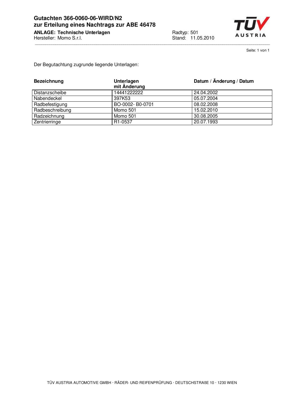 Dieses Gutachten (abe) bezieht sich auf die Alufelge Momo 501 in der Ausführung ET 0, Mittenloch 0 mm (KBA 46478). Im PDF findest du typischerweise zulässige Reifengrößen, Auflagen/Anbauhinweise und – je nach Dokument – Hinweise zur Eintragung.