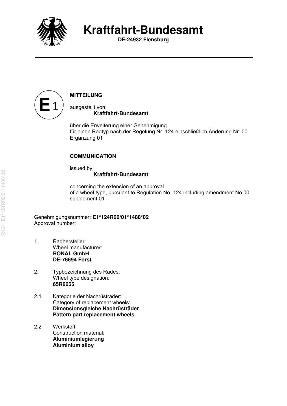 Felgengutachten / ece für Alufelgen Ronal 65R6655 (ET 0, Mittenloch 0 mm) (Zertifikatsnummer e1-124r00-01-1488-02). Hier kostenlos als PDF herunterladen. Der Download-Link ist 24 Stunden gültig und kann bis zu zwei Mal verwendet werden.
