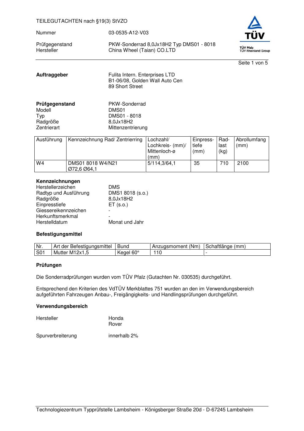 teilegutachten 03-0535-a12-v03 China Wheel DMS01 - 8018