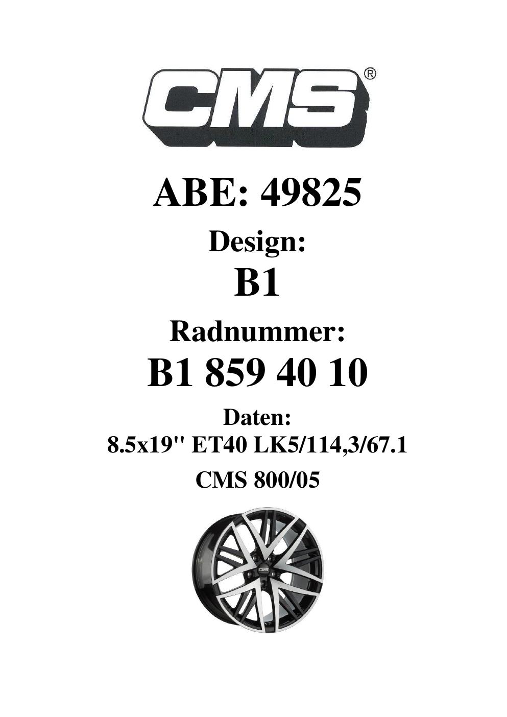 Dieses Gutachten (ABE) bezieht sich auf die Alufelge CMS B1 in der Ausführung 8.5Jx19 ET 0, Mittenloch 0 mm (KBA 49825). Im PDF findest du typischerweise zulässige Reifengrößen, Auflagen/Anbauhinweise und – je nach Dokument – Hinweise zur Eintragung.