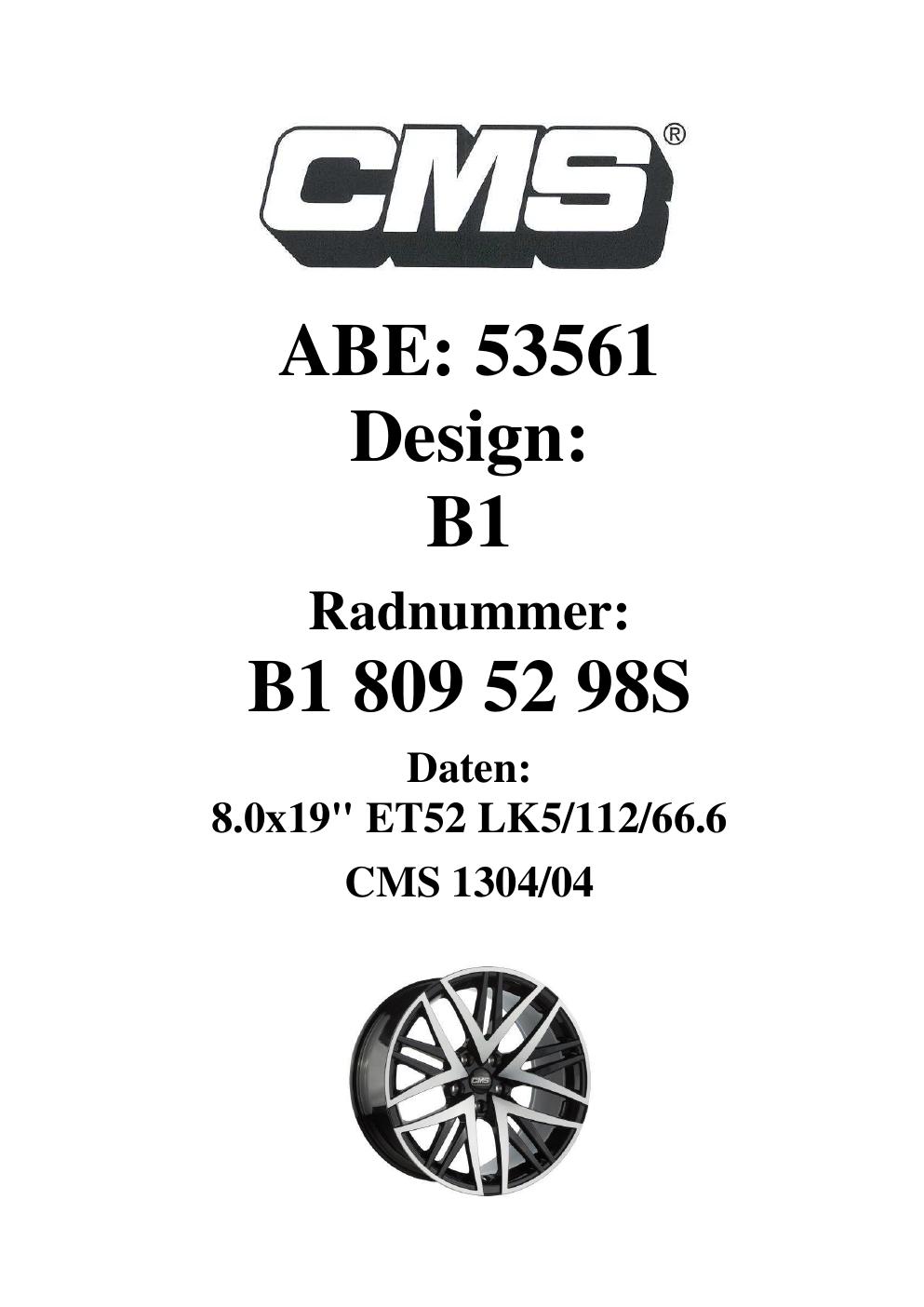 Dieses Gutachten (ABE) bezieht sich auf die Alufelge CMS B1 in der Ausführung 8Jx19 ET 0, Mittenloch 0 mm (KBA 53561). Im PDF findest du typischerweise zulässige Reifengrößen, Auflagen/Anbauhinweise und – je nach Dokument – Hinweise zur Eintragung.