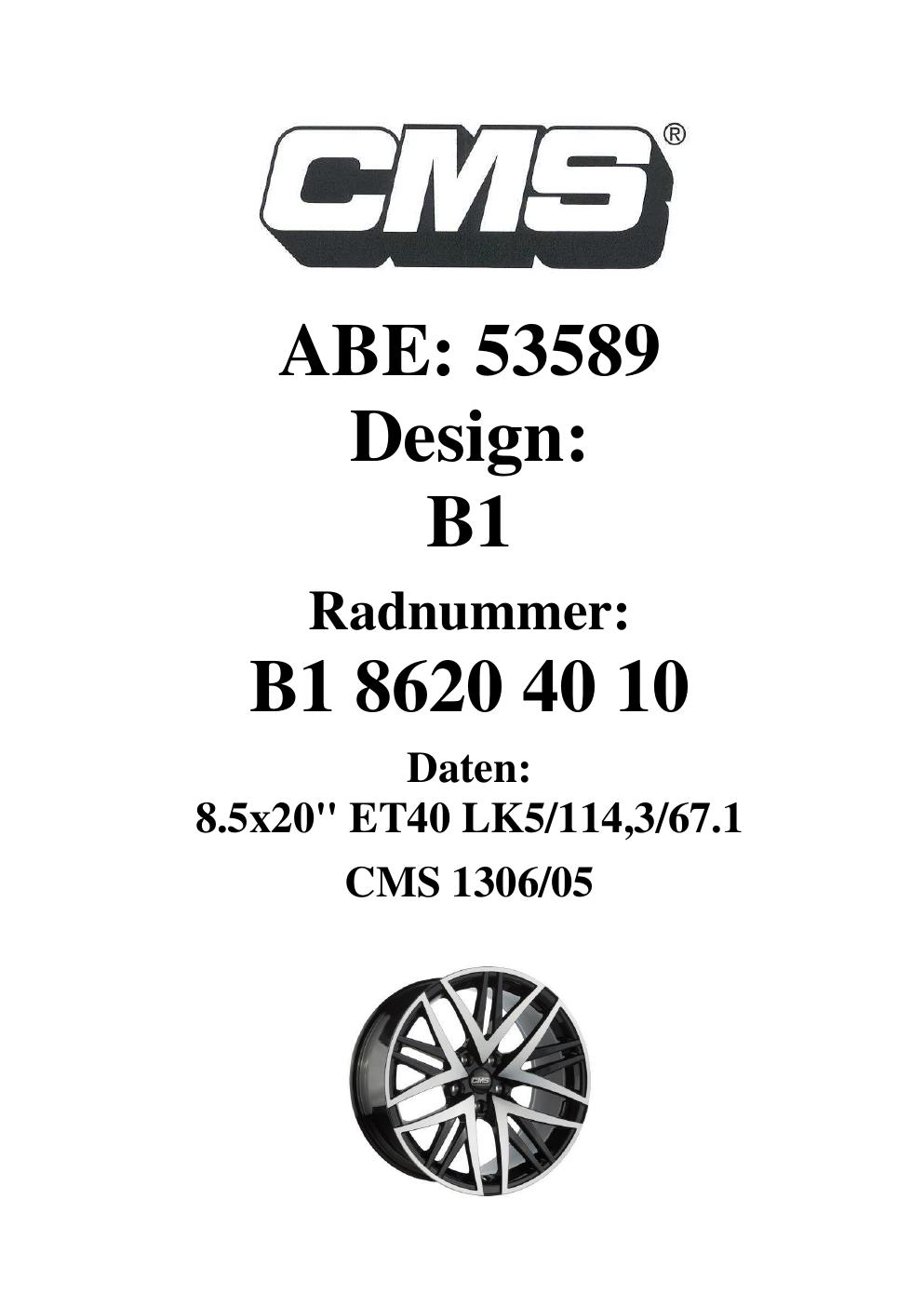 Dieses Gutachten (ABE) bezieht sich auf die Alufelge CMS B1 in der Ausführung 8.5Jx2 ET 0, Mittenloch 0 mm (KBA 53589). Im PDF findest du typischerweise zulässige Reifengrößen, Auflagen/Anbauhinweise und – je nach Dokument – Hinweise zur Eintragung.