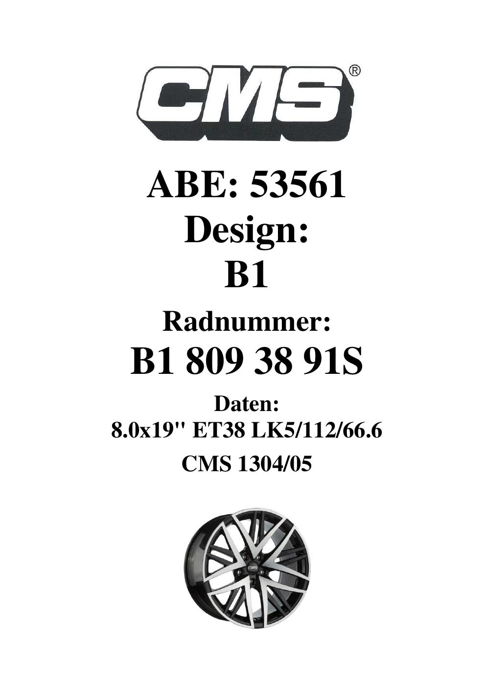 Dieses ABE gehört zur Felge CMS B1 in 8Jx19 ET0 mit KBA 53561. Die Seite ist dafür gedacht, dass du schnell prüfen kannst, ob KBA, Design und Größe zu deiner Felge passen und danach direkt das richtige PDF lädst.