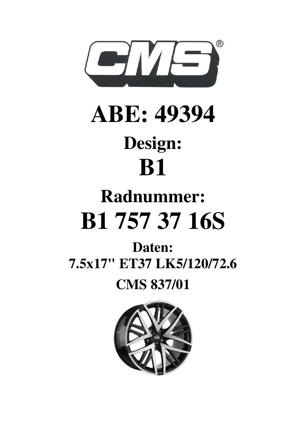 Dieses Gutachten (ABE) bezieht sich auf die Alufelge CMS B1 in der Ausführung 7.5Jx17 ET 0, Mittenloch 0 mm (KBA 49394). Im PDF findest du typischerweise zulässige Reifengrößen, Auflagen/Anbauhinweise und – je nach Dokument – Hinweise zur Eintragung.