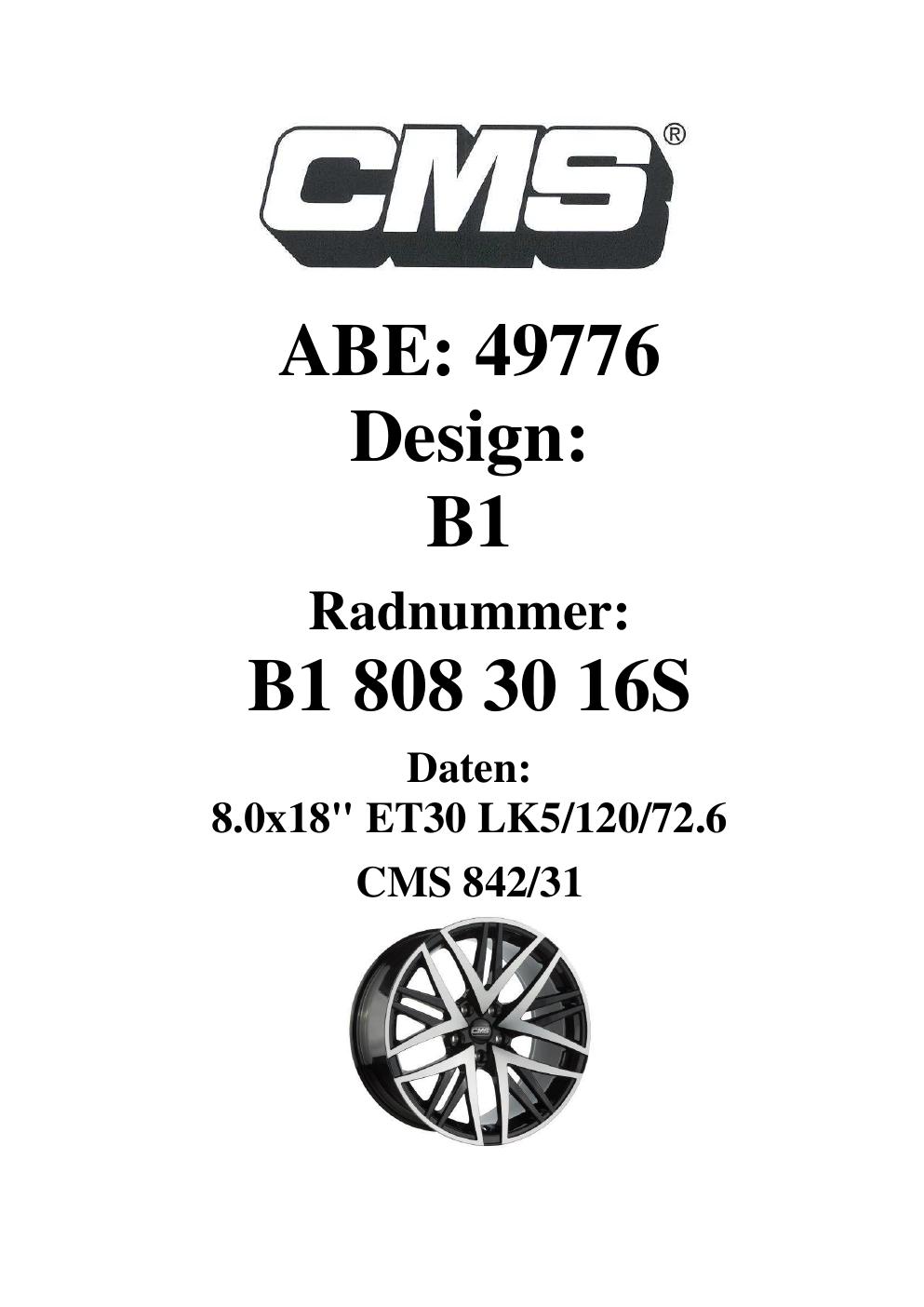Dieses Gutachten (ABE) bezieht sich auf die Alufelge CMS B1 in der Ausführung 8Jx18 ET 0, Mittenloch 0 mm (KBA 49776). Im PDF findest du typischerweise zulässige Reifengrößen, Auflagen/Anbauhinweise und – je nach Dokument – Hinweise zur Eintragung.