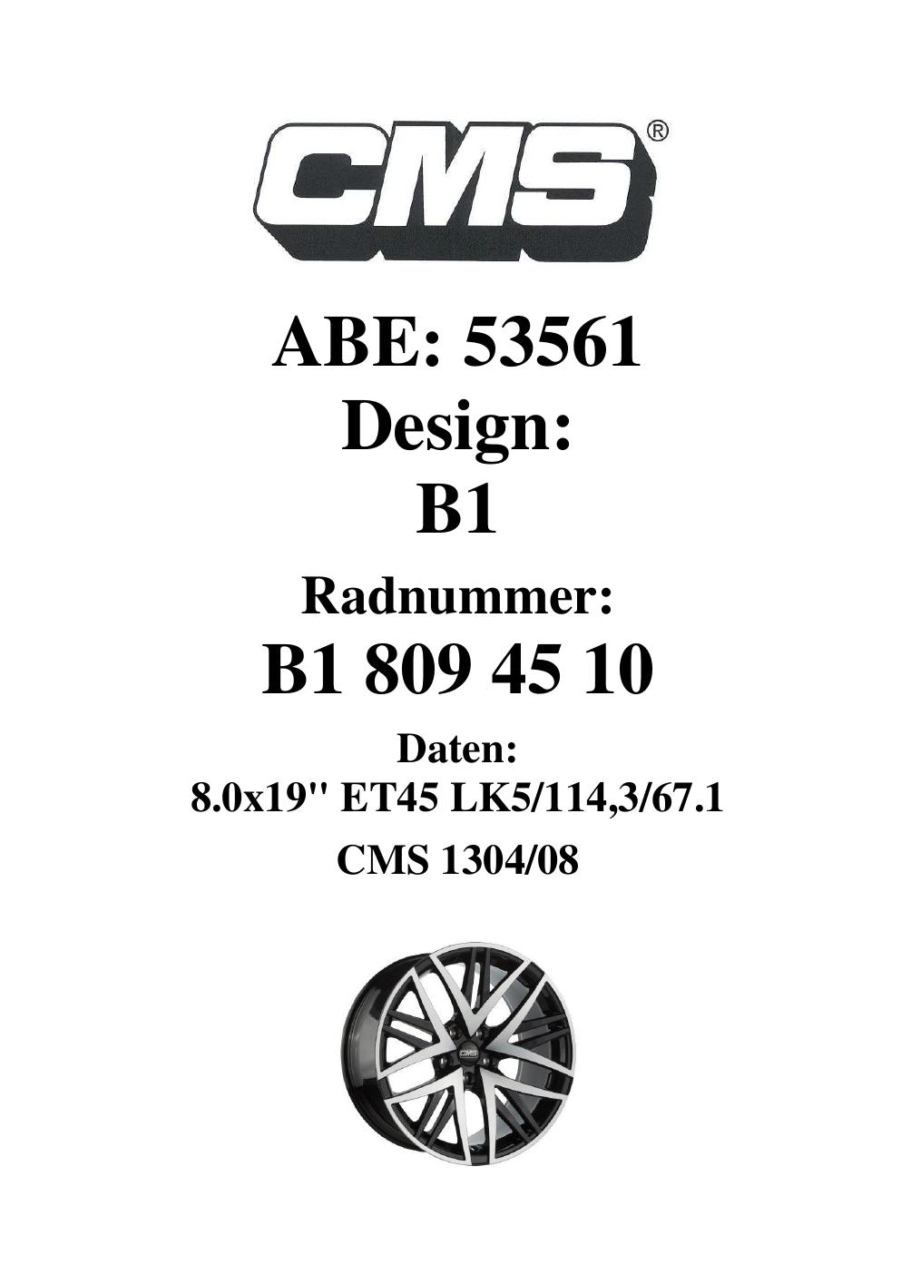 Dieses Gutachten (ABE) bezieht sich auf die Alufelge CMS B1 in der Ausführung 8Jx19 ET 0, Mittenloch 0 mm (KBA 53561). Im PDF findest du typischerweise zulässige Reifengrößen, Auflagen/Anbauhinweise und – je nach Dokument – Hinweise zur Eintragung.