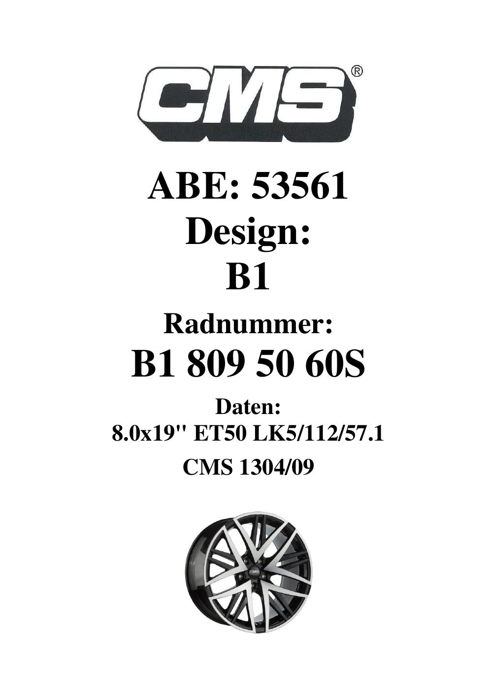 Dieses Gutachten (ABE) bezieht sich auf die Alufelge CMS B1 in der Ausführung 8Jx19 ET 0, Mittenloch 0 mm (KBA 53561). Im PDF findest du typischerweise zulässige Reifengrößen, Auflagen/Anbauhinweise und – je nach Dokument – Hinweise zur Eintragung.