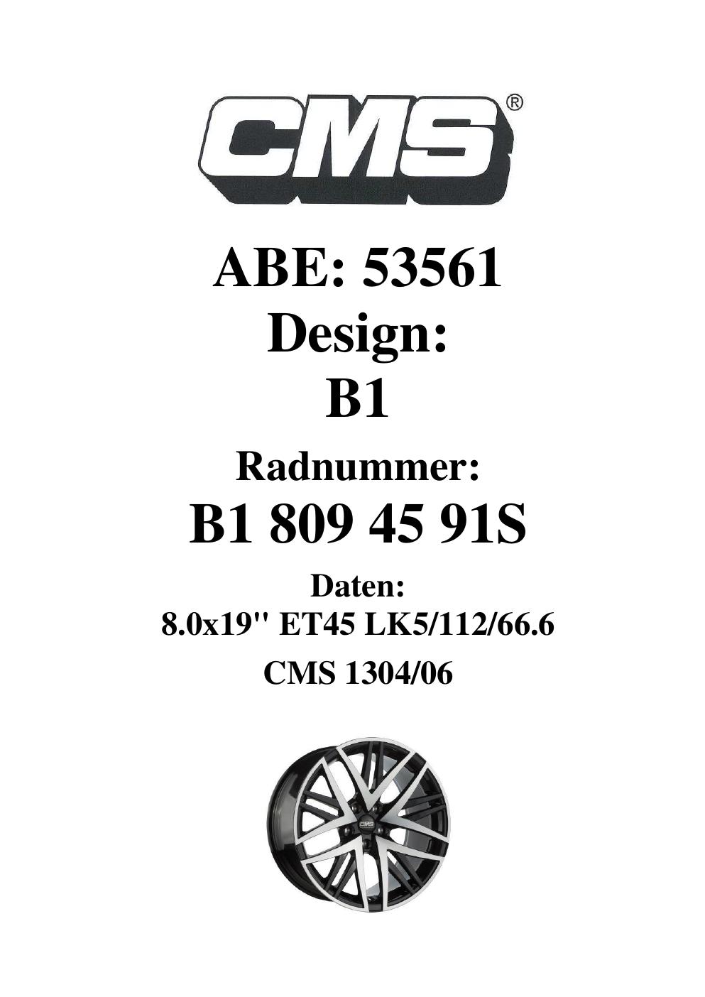 Dieses Gutachten (ABE) bezieht sich auf die Alufelge CMS B1 in der Ausführung 8Jx19 ET 0, Mittenloch 0 mm (KBA 53561). Im PDF findest du typischerweise zulässige Reifengrößen, Auflagen/Anbauhinweise und – je nach Dokument – Hinweise zur Eintragung.