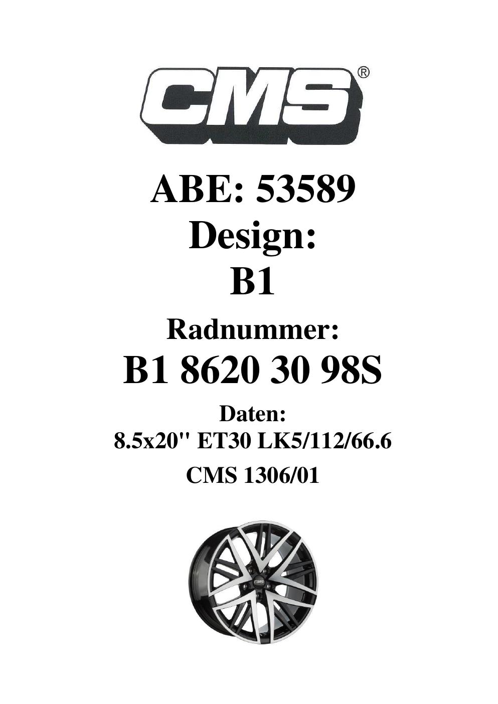 Dieses Gutachten (ABE) bezieht sich auf die Alufelge CMS B1 in der Ausführung 8.5Jx2 ET 0, Mittenloch 0 mm (KBA 53589). Im PDF findest du typischerweise zulässige Reifengrößen, Auflagen/Anbauhinweise und – je nach Dokument – Hinweise zur Eintragung.