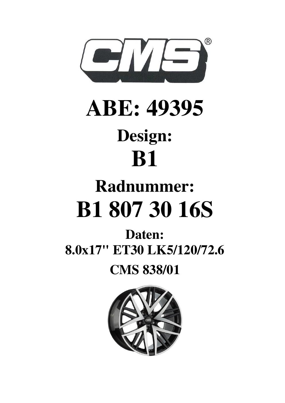 Dieses Gutachten (ABE) bezieht sich auf die Alufelge CMS B1 in der Ausführung 8Jx17 ET 0, Mittenloch 0 mm (KBA 49395). Im PDF findest du typischerweise zulässige Reifengrößen, Auflagen/Anbauhinweise und – je nach Dokument – Hinweise zur Eintragung.