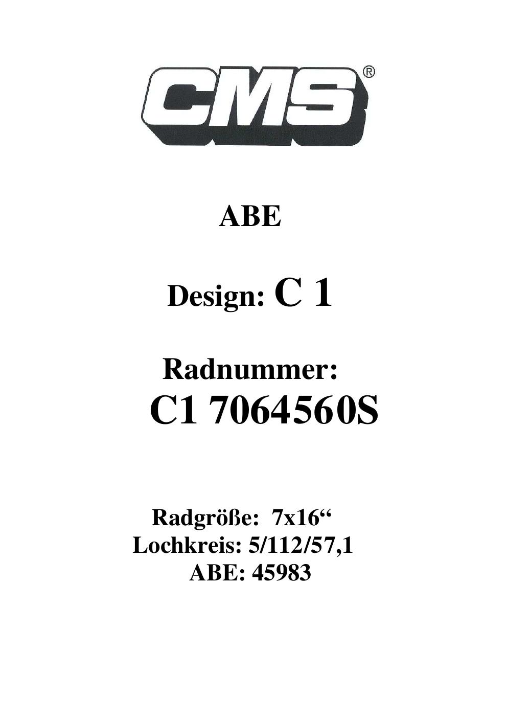 Dieses Gutachten (ABE) bezieht sich auf die Alufelge CMS C1 in der Ausführung ET 0, Mittenloch 0 mm (KBA 45983). Im PDF findest du typischerweise zulässige Reifengrößen, Auflagen/Anbauhinweise und – je nach Dokument – Hinweise zur Eintragung.