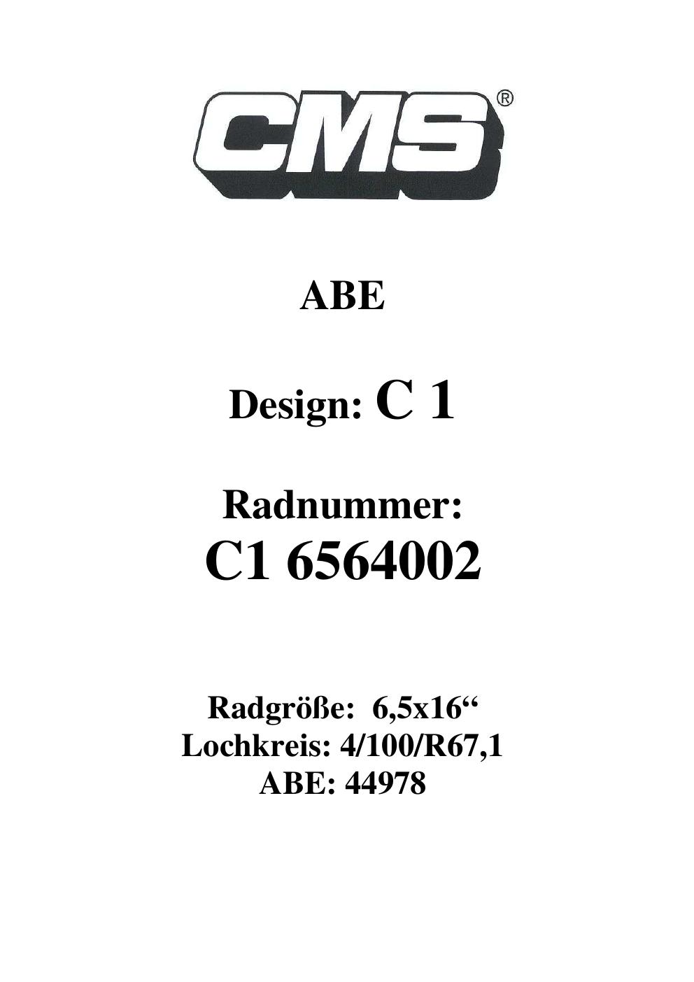 Dieses Gutachten (ABE) bezieht sich auf die Alufelge CMS C1 in der Ausführung ET 0, Mittenloch 0 mm (KBA 44978). Im PDF findest du typischerweise zulässige Reifengrößen, Auflagen/Anbauhinweise und – je nach Dokument – Hinweise zur Eintragung.