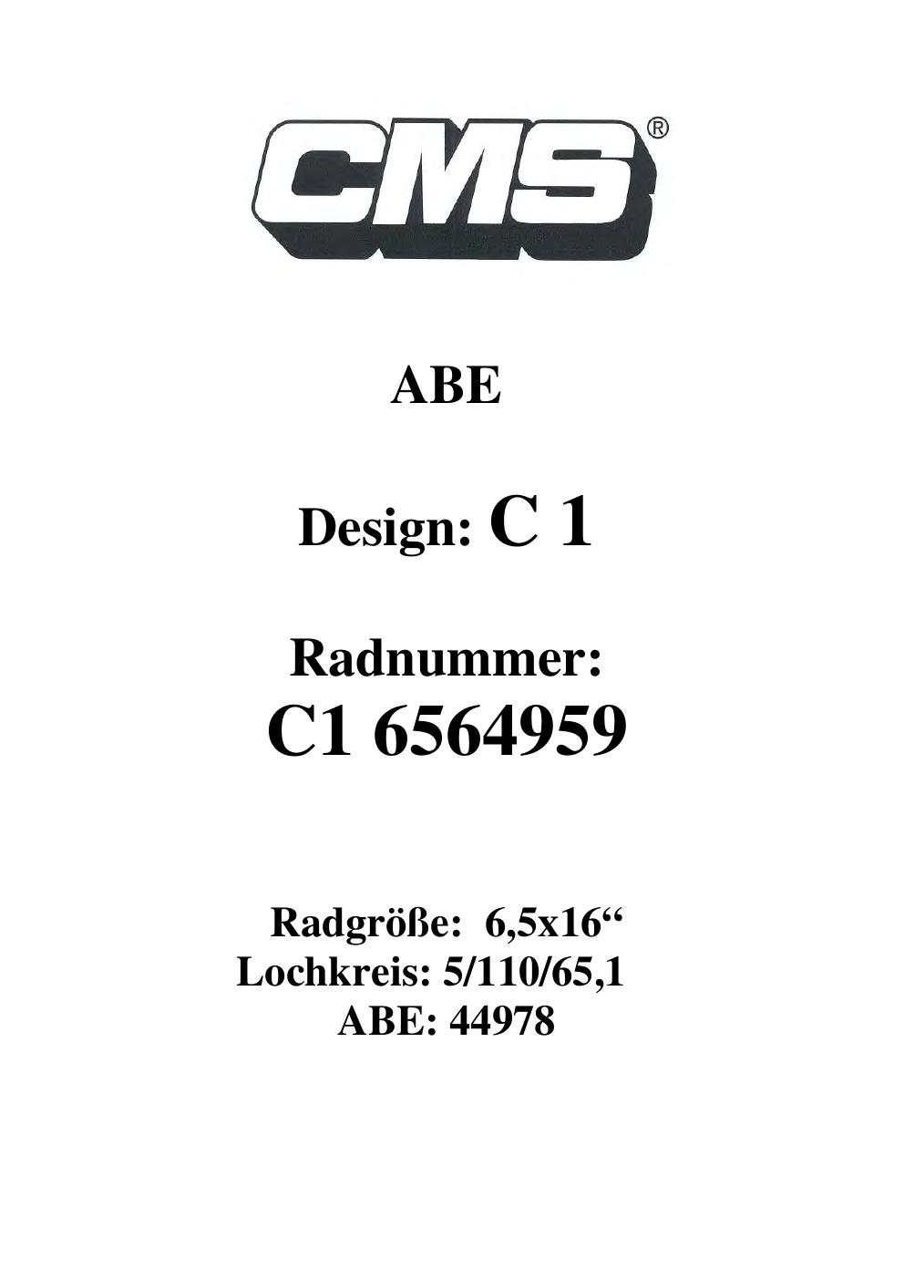 Dieses Gutachten (ABE) bezieht sich auf die Alufelge CMS C1 in der Ausführung ET 0, Mittenloch 0 mm (KBA 44978). Im PDF findest du typischerweise zulässige Reifengrößen, Auflagen/Anbauhinweise und – je nach Dokument – Hinweise zur Eintragung.