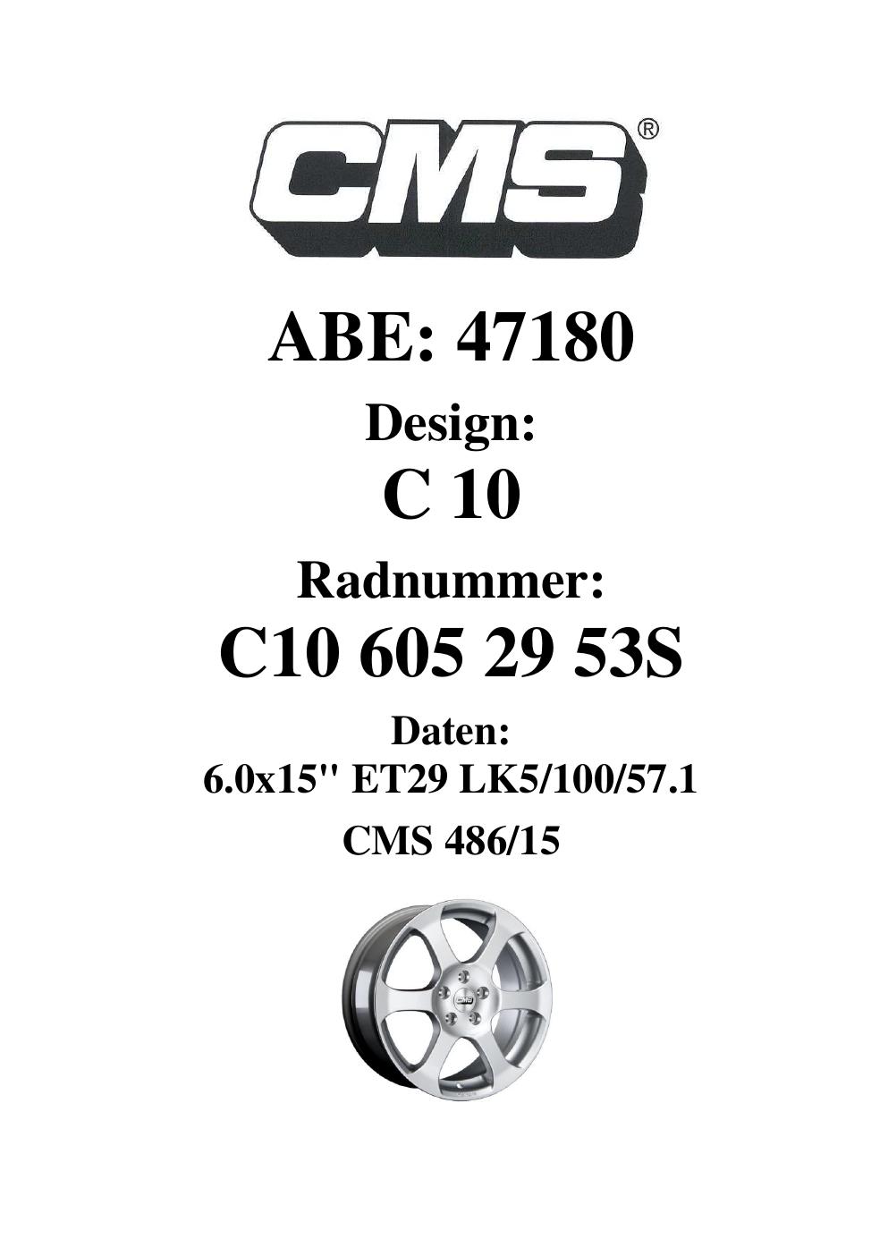 Dieses Gutachten (ABE) bezieht sich auf die Alufelge CMS C10 in der Ausführung 6Jx15 ET 0, Mittenloch 0 mm (KBA 47180). Im PDF findest du typischerweise zulässige Reifengrößen, Auflagen/Anbauhinweise und – je nach Dokument – Hinweise zur Eintragung.