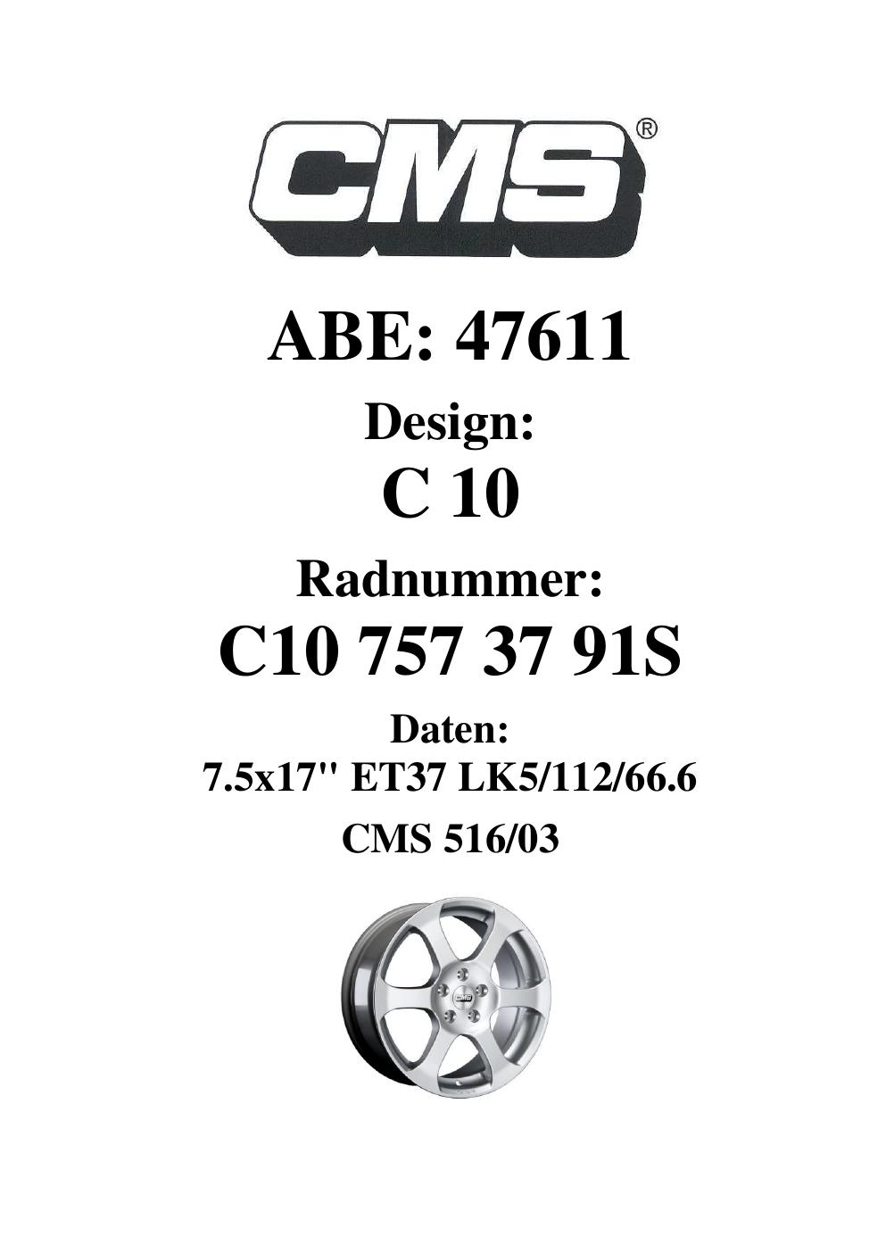Dieses Gutachten (ABE) bezieht sich auf die Alufelge CMS C10 in der Ausführung 7.5Jx17 ET 0, Mittenloch 0 mm (KBA 47611). Im PDF findest du typischerweise zulässige Reifengrößen, Auflagen/Anbauhinweise und – je nach Dokument – Hinweise zur Eintragung.