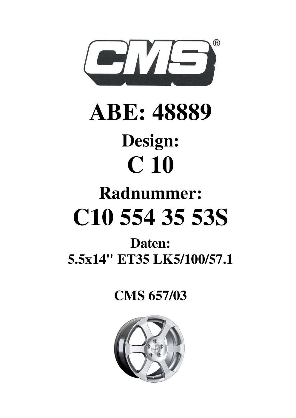 Dieses ABE gehört zur Felge CMS C10 in 5.5Jx14 ET0 mit KBA 48889. Die Seite ist dafür gedacht, dass du schnell prüfen kannst, ob KBA, Design und Größe zu deiner Felge passen und danach direkt das richtige PDF lädst.