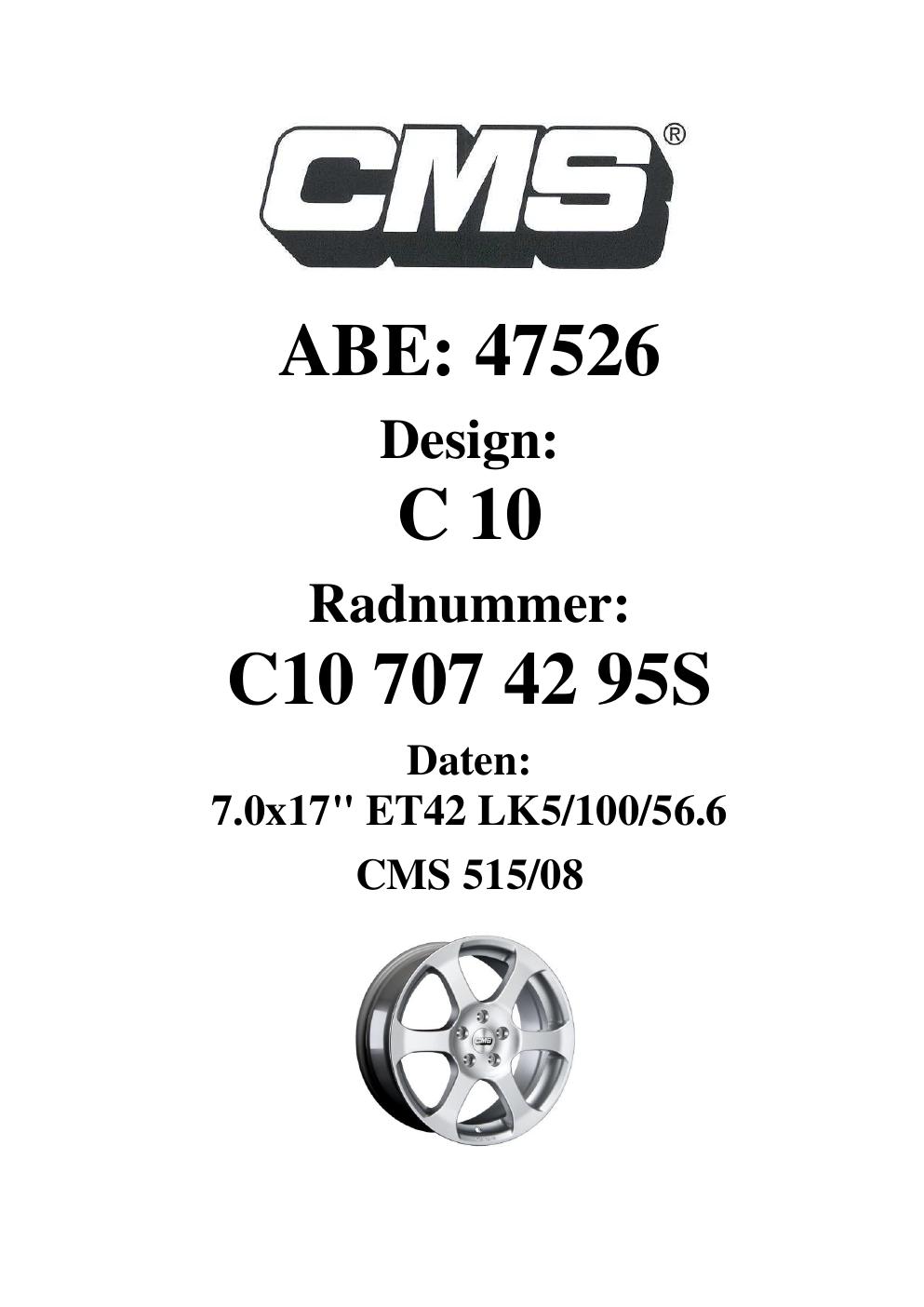 Dieses Gutachten (ABE) bezieht sich auf die Alufelge CMS C10 in der Ausführung 7Jx17 ET 0, Mittenloch 0 mm (KBA 47526). Im PDF findest du typischerweise zulässige Reifengrößen, Auflagen/Anbauhinweise und – je nach Dokument – Hinweise zur Eintragung.