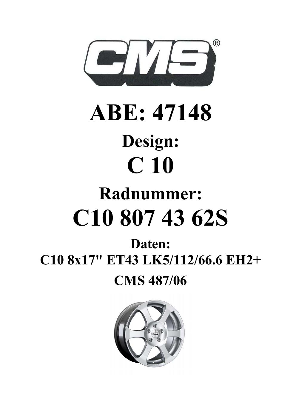 Felgengutachten / ABE für Alufelgen CMS C10 (8Jx17 ET 0, Mittenloch 0 mm) mit KBA 47148 (Zertifikatsnummer 47148). Hier kostenlos als PDF herunterladen. Der Download-Link ist 24 Stunden gültig und kann bis zu zwei Mal verwendet werden.