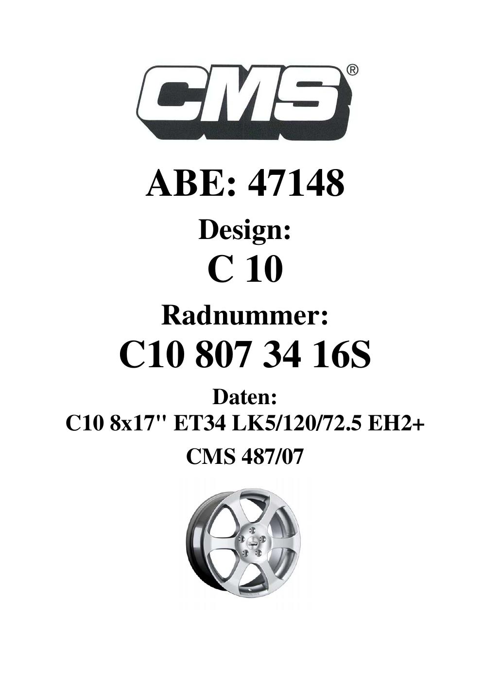 Felgengutachten / ABE für Alufelgen CMS C10 (8Jx17 ET 0, Mittenloch 0 mm) mit KBA 47148 (Zertifikatsnummer 47148). Hier kostenlos als PDF herunterladen. Der Download-Link ist 24 Stunden gültig und kann bis zu zwei Mal verwendet werden.