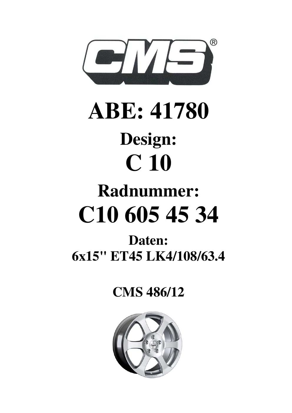 Felgengutachten / ABE für Alufelgen CMS C10 (6Jx15 ET 0, Mittenloch 0 mm) mit KBA 41780 (Zertifikatsnummer 41780). Hier kostenlos als PDF herunterladen. Der Download-Link ist 24 Stunden gültig und kann bis zu zwei Mal verwendet werden.
