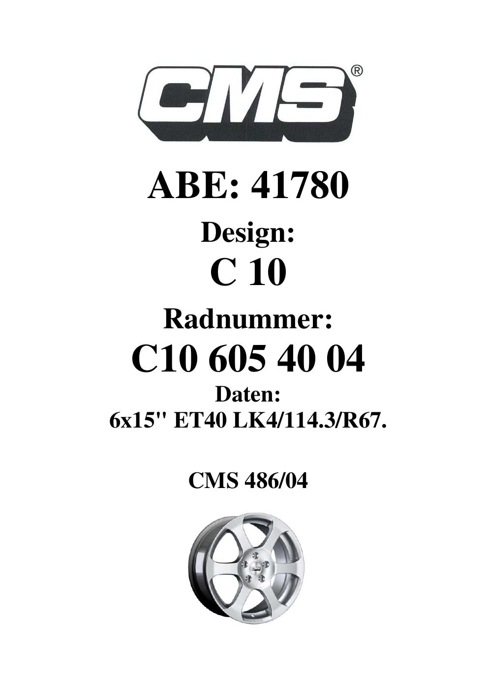 Felgengutachten / ABE für Alufelgen CMS C10 (6Jx15 ET 0, Mittenloch 0 mm) mit KBA 41780 (Zertifikatsnummer 41780). Hier kostenlos als PDF herunterladen. Der Download-Link ist 24 Stunden gültig und kann bis zu zwei Mal verwendet werden.
