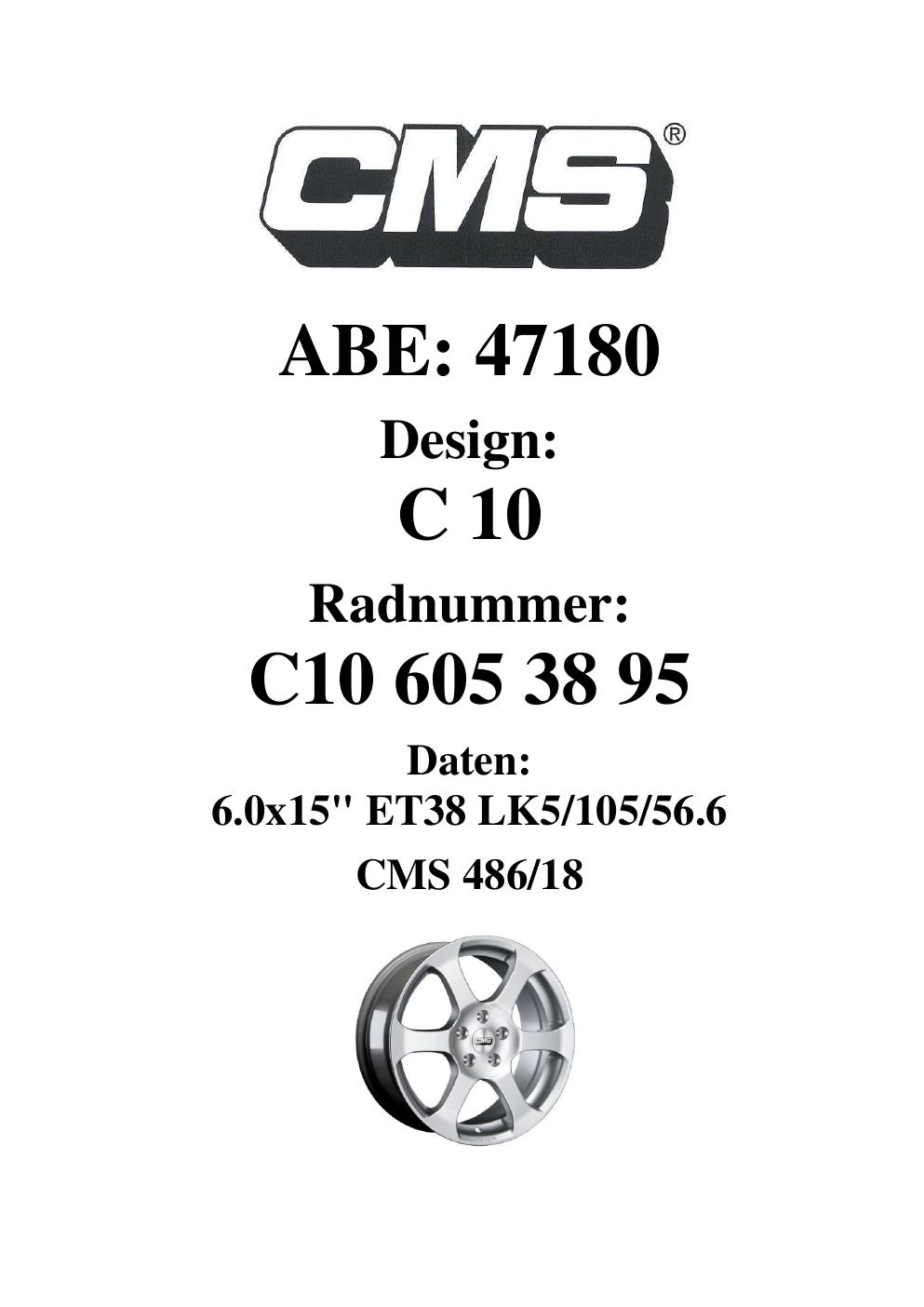 Dieses Gutachten (ABE) bezieht sich auf die Alufelge CMS C10 in der Ausführung 6Jx15 ET 0, Mittenloch 0 mm (KBA 47180). Im PDF findest du typischerweise zulässige Reifengrößen, Auflagen/Anbauhinweise und – je nach Dokument – Hinweise zur Eintragung.