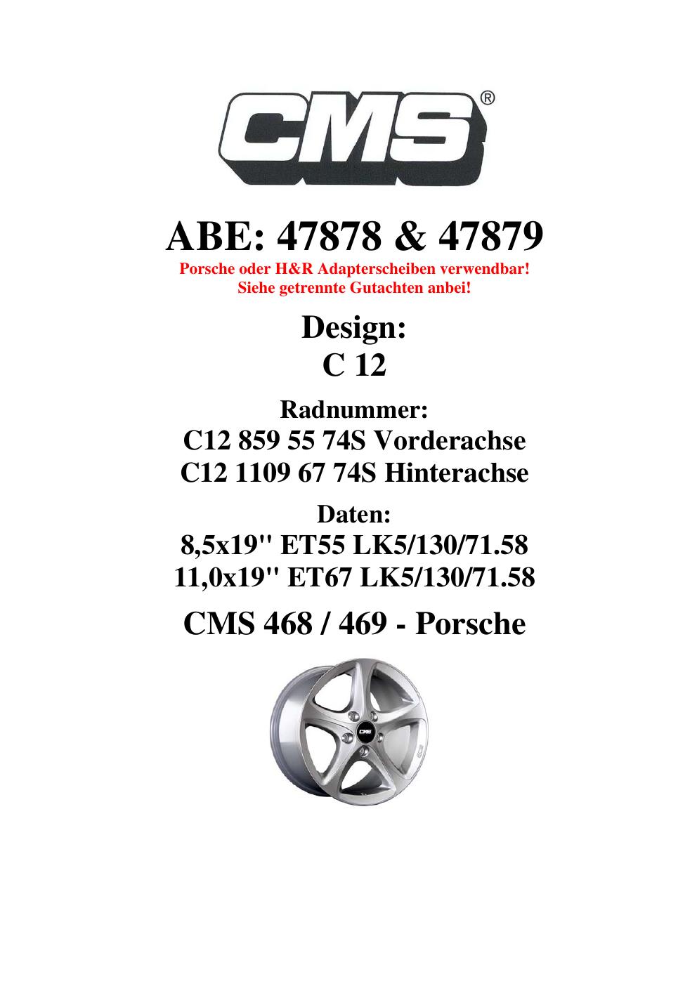Dieses Gutachten (ABE) bezieht sich auf die Alufelge CMS C12 in der Ausführung 8.5Jx19 ET 0, Mittenloch 0 mm (KBA 47878). Im PDF findest du typischerweise zulässige Reifengrößen, Auflagen/Anbauhinweise und – je nach Dokument – Hinweise zur Eintragung.
