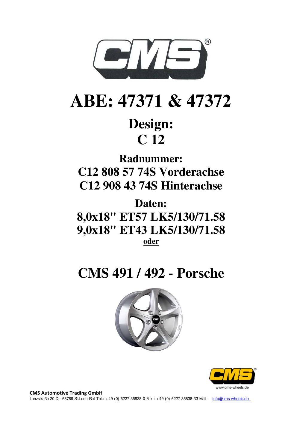 Dieses Gutachten (ABE) bezieht sich auf die Alufelge CMS C12 in der Ausführung 8Jx18 ET 0, Mittenloch 0 mm (KBA 47371). Im PDF findest du typischerweise zulässige Reifengrößen, Auflagen/Anbauhinweise und – je nach Dokument – Hinweise zur Eintragung.