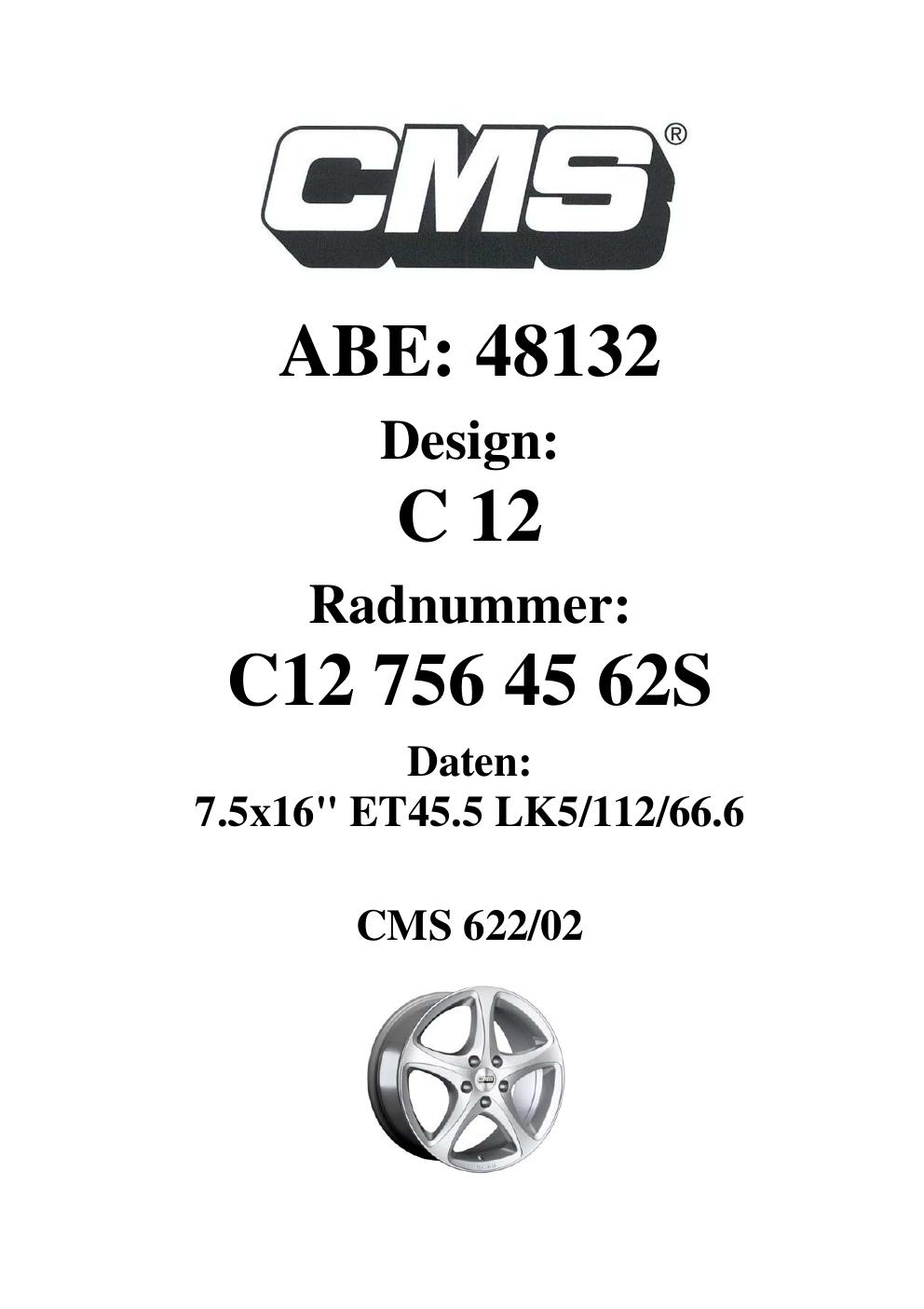 Dieses Gutachten (ABE) bezieht sich auf die Alufelge CMS C12 in der Ausführung 7.5Jx16 ET 0, Mittenloch 0 mm (KBA 48132). Im PDF findest du typischerweise zulässige Reifengrößen, Auflagen/Anbauhinweise und – je nach Dokument – Hinweise zur Eintragung.